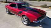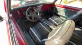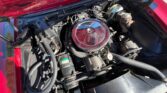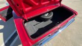 The exterior is finished in Bright Cherry Red with a small flake metallic base/clear coat. It is complemented by black accent hash stripes and custom graphics painted under clear. The body lines are straight, with even gaps on the doors, hood, and trunk, all of which open and close properly. The car is rust-free, with solid original floor pans. Chrome bumpers, emblems, and trim are in 9 out of 10 condition. The trunk is clean and rust-free, retaining the original spare tire and an amplifier. It rides on polished 18-inch Eagle alloy wheels with 2018 Firehawk tires.