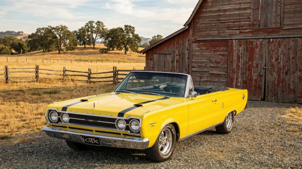 1967 Plymouth GTX Convertible, one of the rarest and most prestigious muscle cars of the 1960s. Plymouth often referred to the GTX as the “gentleman’s hot rod” for its unique blend of luxury and high performance.